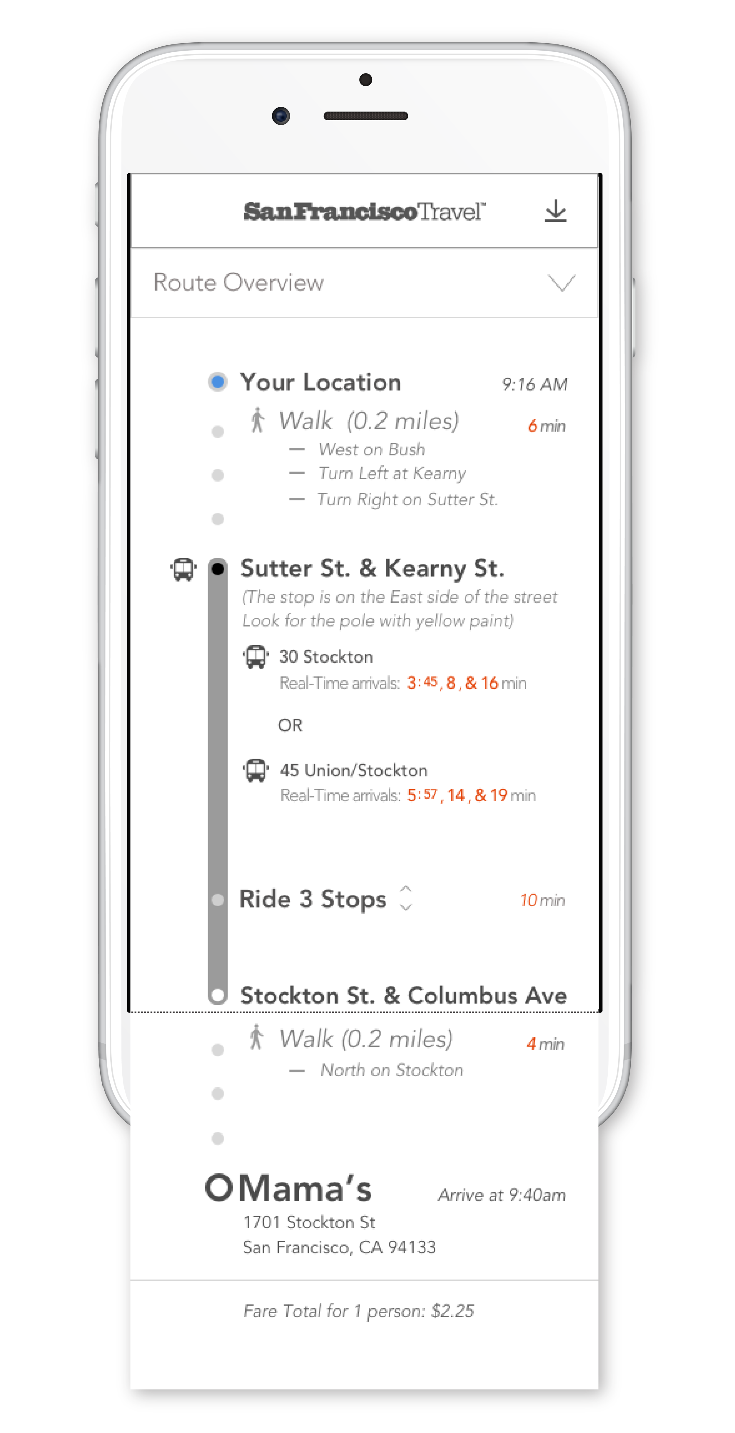 - Detailed Route Overview; step-by-step directions, bus time arrivals, bus stop location.